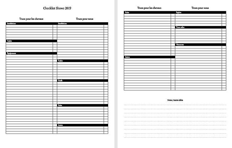 J’ai toujours eu des checklists pour les shows, depuis mon premier avec mon propre cheval en 2015 jusqu’à aujourd’hui, et elles ont beaucoup évolué à travers les années. Par contre, la base reste la même. Premièrement, j’ai une liste pour les fins de semaine, où j’inscris ce que j’ai besoin d’avoir avec moi avant de partir pour l’écurie et pour le lieu de la compétition. C’est ma liste principale que je vérifie chaque fois afin d’être sûre d’avoir tout, et j’ajoute des choses au besoin. J’ai divisé la page en deux, avec un côté pour les chevaux et un pour nous, et il y a différentes catégories pour regrouper le stock,comme les installations, l’équipement, les soins et autres. Ensuite, j’ai une liste de préparation pour les shows, soit ce que j’ai à faire avant le début de la saison pour que tout soit prêt. Je l’ai faite dernièrement, et je me suis rendue compte que j’ai pas mal de choses à faire avant d’être fin prête à partir sur la route! Il y a, entre autres, déshiverniser mon trailer, acheter du foin et de la ripe pour cet été, envoyer mes formulaires d’inscriptions pour les associations que je vais faire, organiser mon rangement et mon living dans le trailer, et quelques autres choses que je dois absolument faire pour pouvoir partir en show. Le printemps ne sera pas de tout repos cette année pour moi! Voici à quoi ressemble ma checklist :