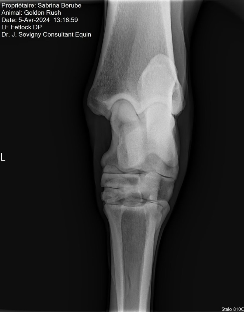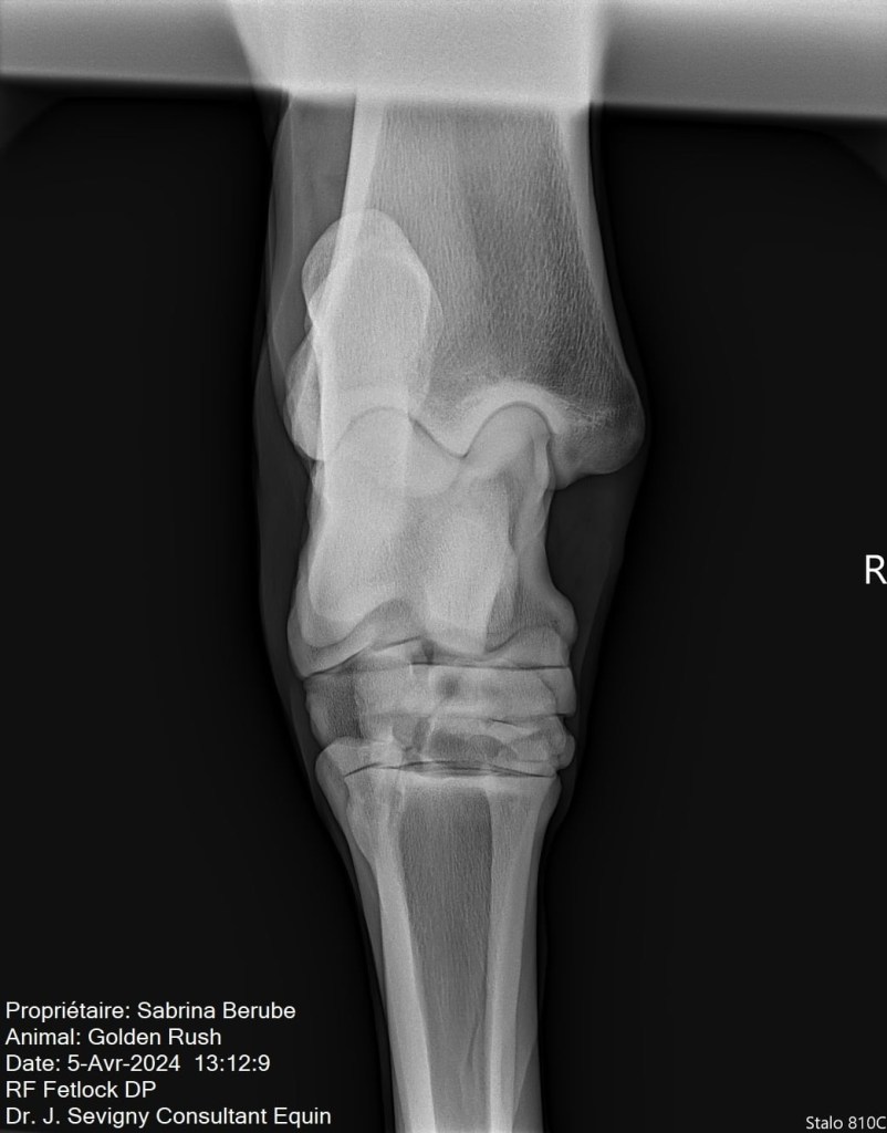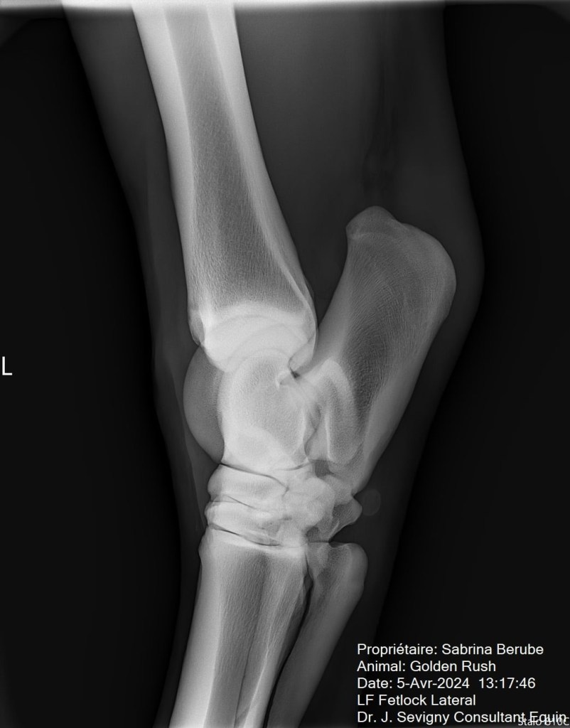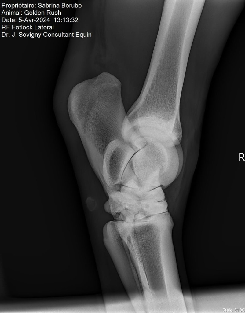 Mon cheval, Saphir, a eu 16 ans cette année. Il a toujours été très solide sur ses pattes et seulement que très rarement il a boité ou eu un problème quelconque. Par contre, il a commencé à être un peu plus raide d’un postérieur l’an dernier à la fin de la saison de compétition. J’ai remarqué qu’il manquait d’amplitude à son postérieur droit, surtout à froid. Il ne boitait pas, il n’avait pas d’autre symptômes, mais il semblait y avoir un léger inconfort qui ne partait pas malgré les soins comme des frictions, entre autres. En se réchauffant ça devenait moins pire mais il restait toujours un petit quelque chose. J’ai donc décidé de faire faire des radiographies suite à l’examen de ma vétérinaire ce printemps.