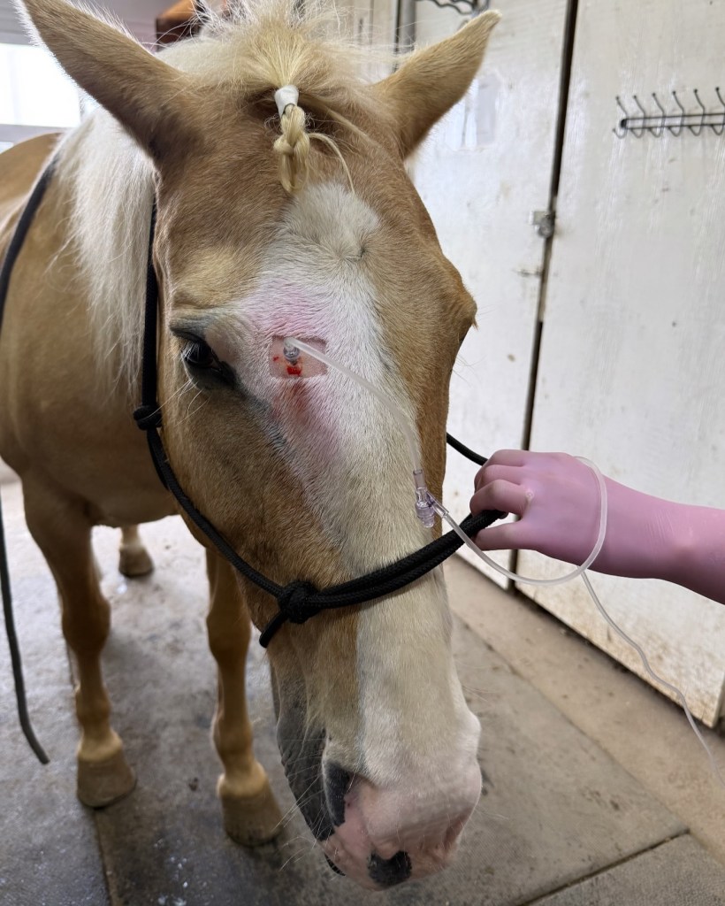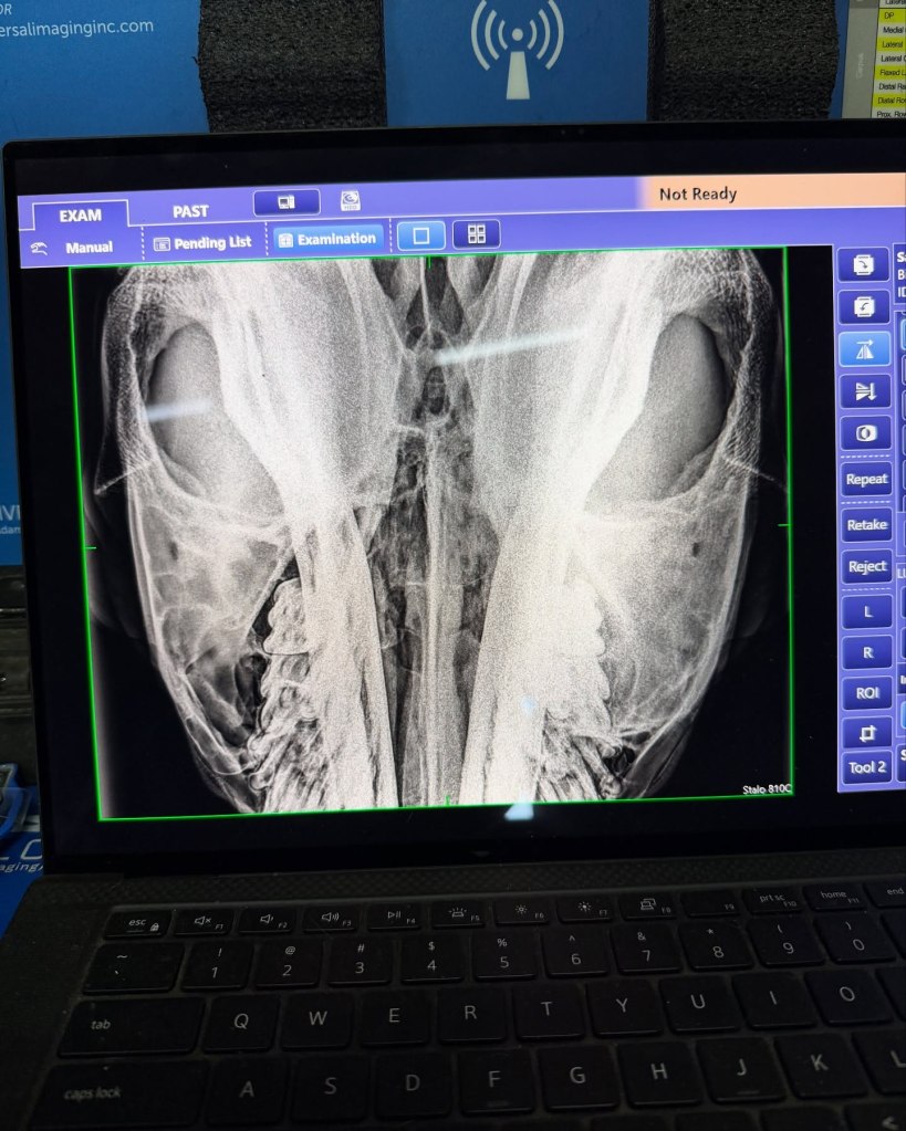 Ensuite, au début juin, on a fait une petite trépanation de son sinus frontal et on a drainé son sinus à la seringue, puis flushé à la saline. On a sorti environ 250ml de mucus/pus! Le pauvre. Il a eu une semaine de pénicilline intra-musculaire suite à ça aussi. Et puis restait plus d’à espérer que ça revienne pas… mais malheureusement, ça a recommencé vers la fin de l’été. La prochaine étape était de faire un CT scan à Saint-Hyacinthe pour essayer de trouver la cause, puis de traiter en conséquence.