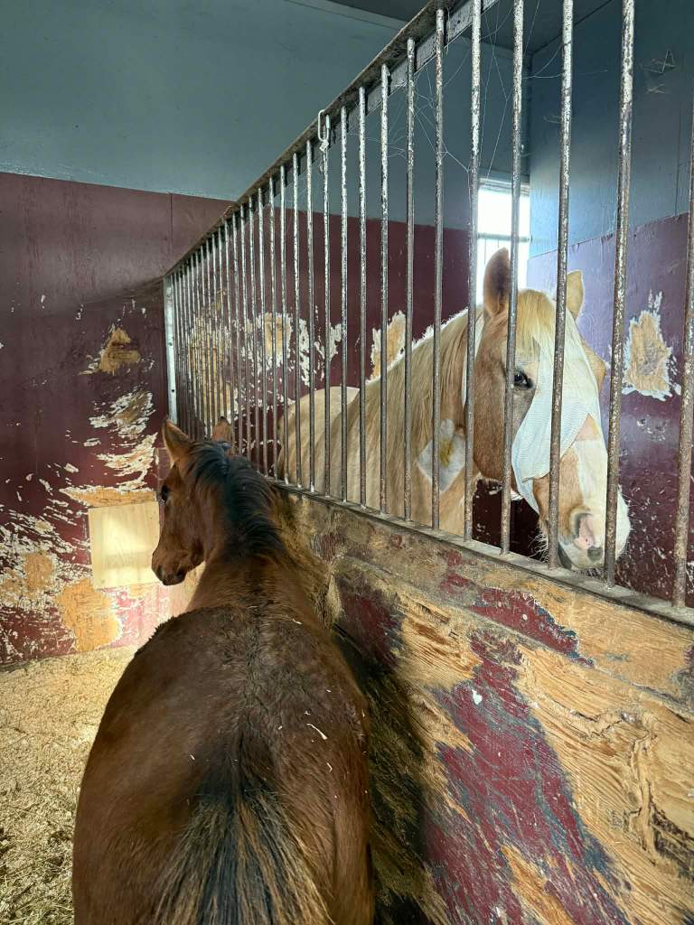 Suivant son retour, mon pauvre enfant habitué d’être à l’extérieur 24/24 a dû passer 2 semaines au box pour que la plaie de trépanation guérisse. Il a eu la chance d’être voisin avec la pouliche de mon amie par contre, et il l’a adoptée direct. Il avait pas l’air trop misérable finalement!